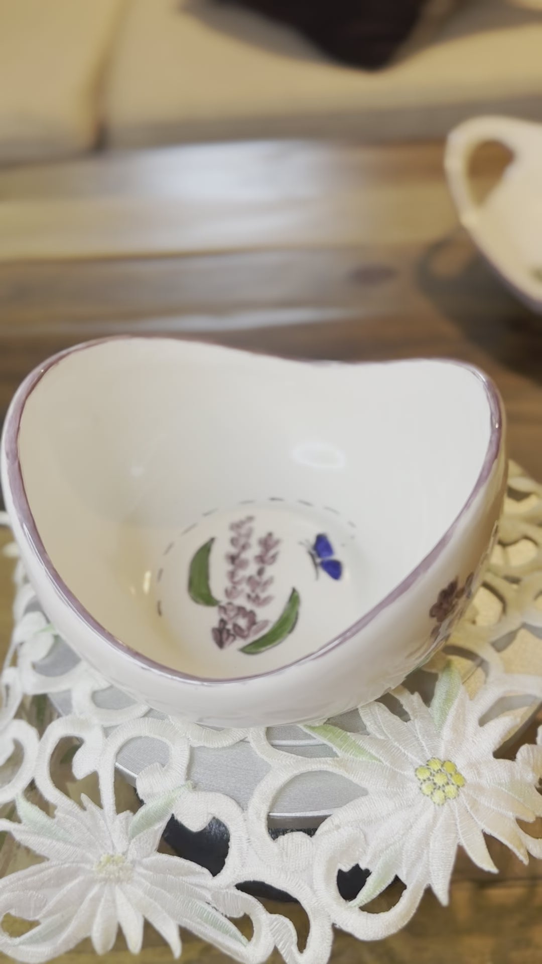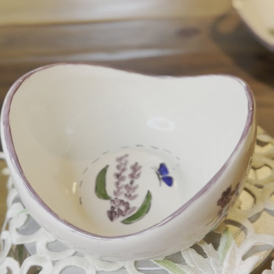 Enjoy an added touch of sweetness with this hand-painted ceramic serving bowl, featuring lavender flowers and a visiting butterfly. Perfect for serving your guests with style, and just the right touch for any garden party. This serving bowl is just the right size for your snacks, treats, and dips.